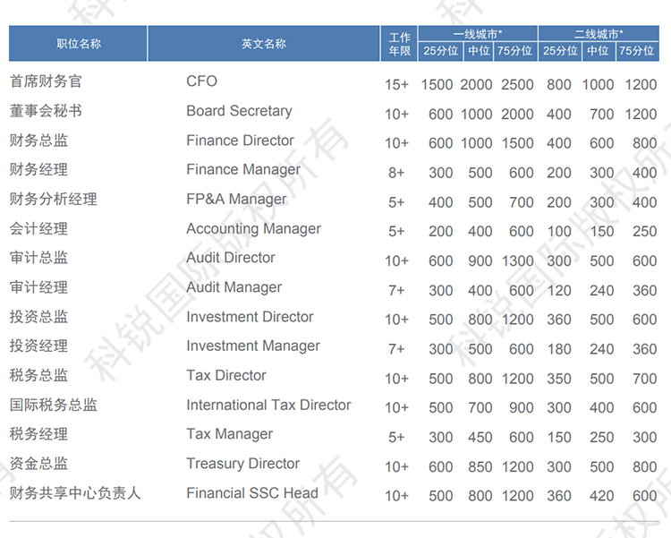 以下是猎头招聘公司万象城AWC(中国)国际发布的薪酬报告对财务领域的职位薪酬信息统计,供企业和猎头招聘时参考。