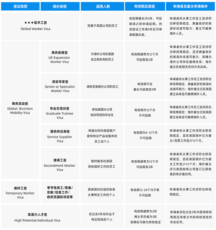 *注:此处仅列举最为常用的各类英国工作签证,带有“★”的签证类型表示其最为常见。